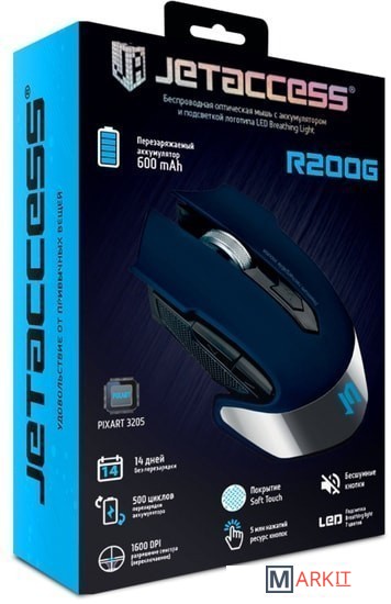JETACCESS R200G — универсальная беспроводная мышь премиум класса со встроенным аккумулятором и деликатной подсветкой LED Breathing Light.Встроенный аккумулятор емкостью 600 mAh позволяет в обычном офисном 8-часовом режиме работать до 14 дней. Для полной зарядки аккумулятора необходимо 2 часа, после этого мышь снова в строю на целых 2 недели. В производстве модели JETACCESS R200G используются аккумуляторы высокого качества, выдерживающие до 500 циклов зарядки/разрядки.